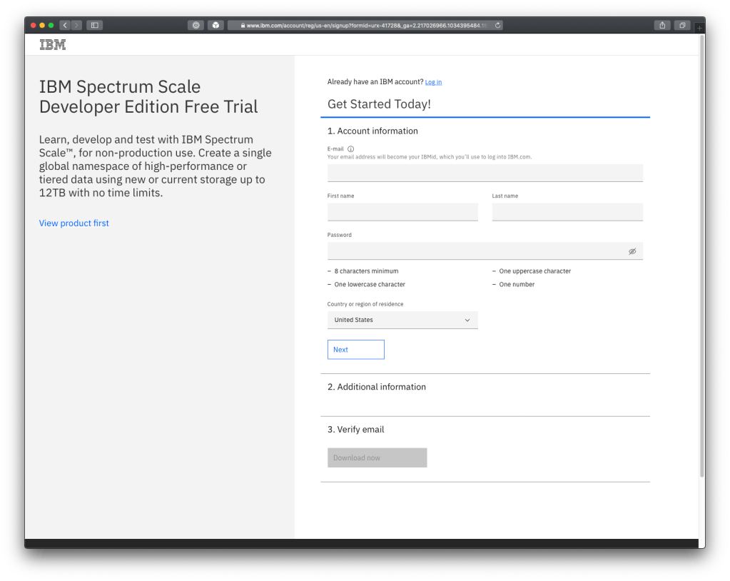 Click on the “Try free developer edition” button near the top. This will lead you to a form to either create an IBM account or log in using your existing “IBMid”: