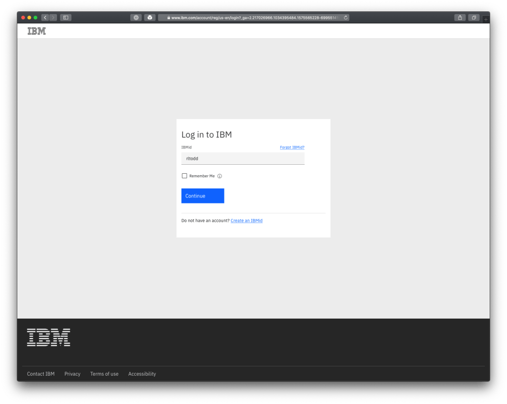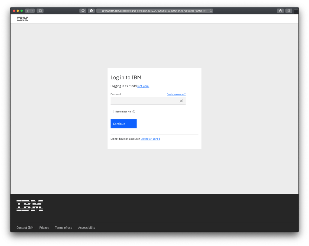 Here I type in my existing “IBMid” and press “Continue”. That leads me to a page where I enter my password: