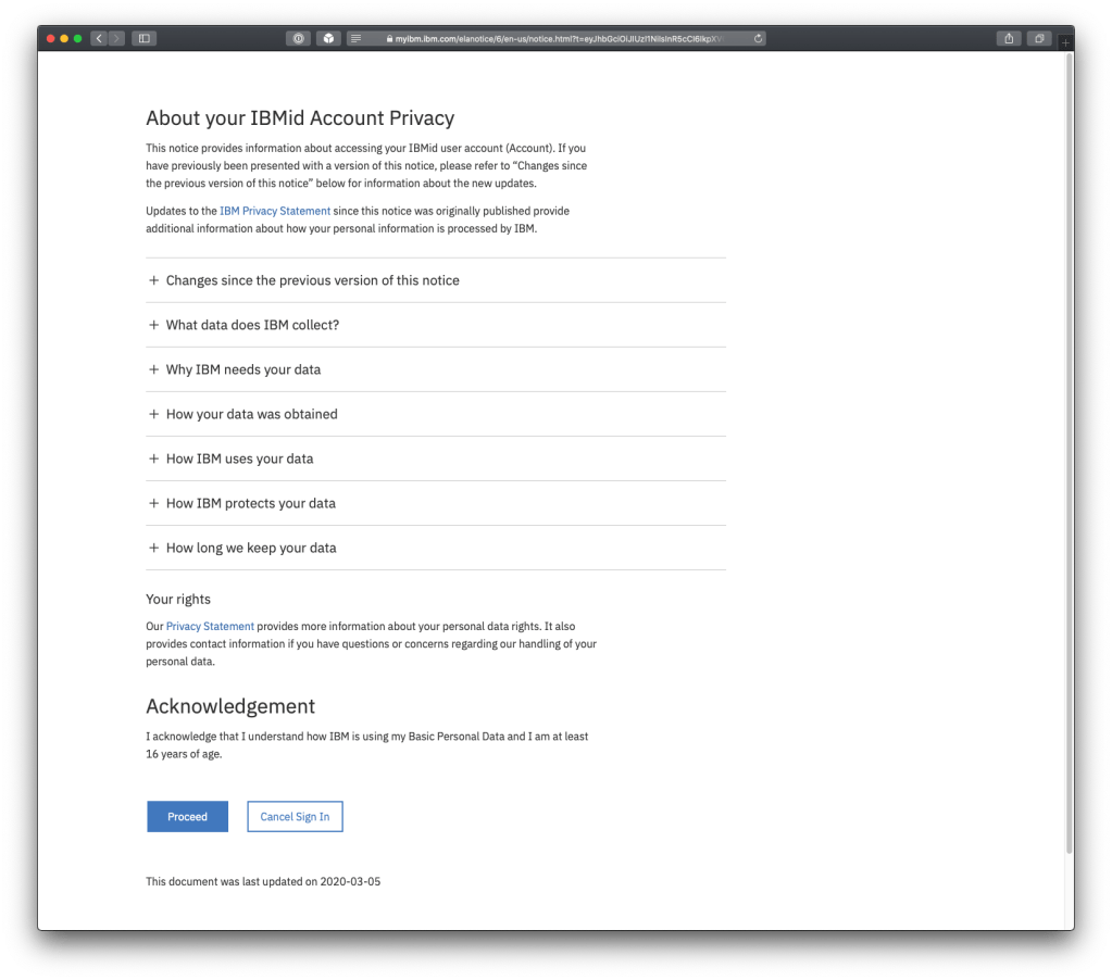 After I entered my password and pressed “Continue”, I am asked to confirm I understand the IBMid privacy policy.