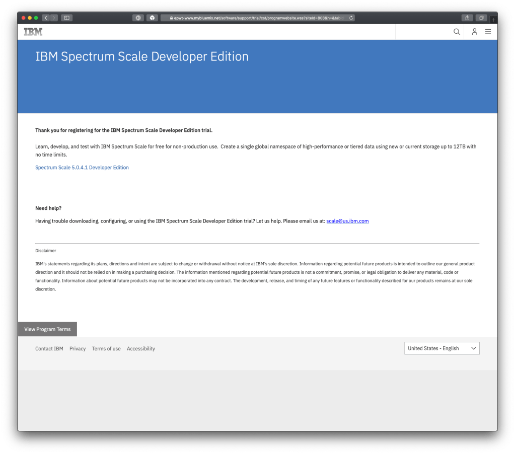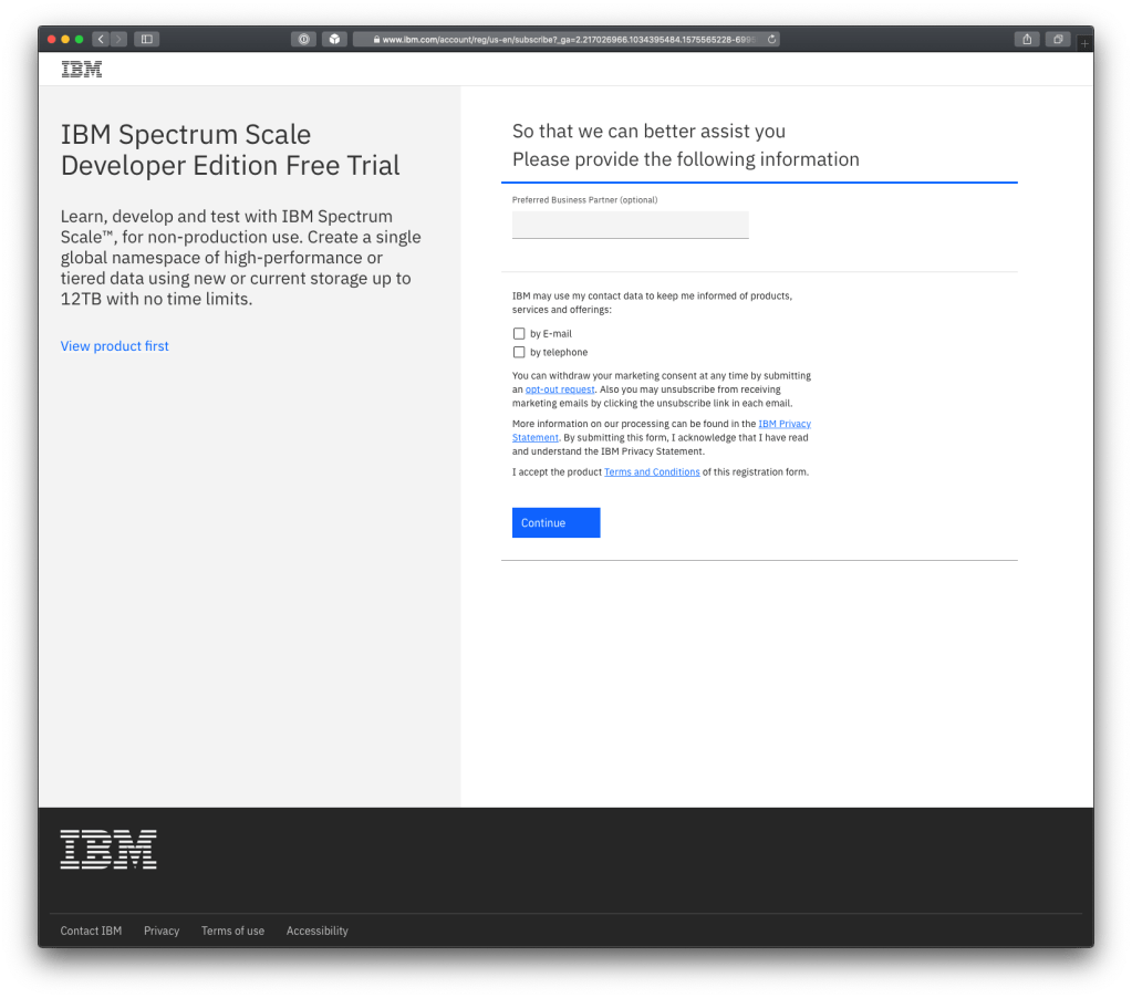 You do not need to agree to any further communication to use the Spectrum Scale Developer Edition! I did not consent to any further communication, and pressed “Continue” to get to the download link: